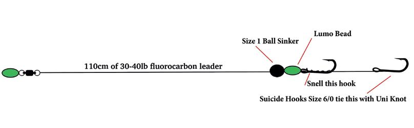 In Port Phillip Bay, the best rig is a twin suicide hook rig. The bottom hooks is simply tied with a uni knot and the top hook is snelled. There are many YouTube videos you can watch that will show you how to snell a hook and it’s important that you learn this as it’s essential to rigging baits for hook exposure and natural presentation. Remember, given Port Phillip’s gentle tidal flow, heavy weights are unnecessary, so a light size 1 ball sinker is all you need in depths above 10 metres. On rough days you can move to a size 2 and in water less than 10 metres don’t use any sinker at all. This light weight allows for a more natural presentation of the bait. I use high quality 30-40lb fluorocarbon for leader. Fluro means I can go lighter and thinner and still retain excellent abrasion resistance.