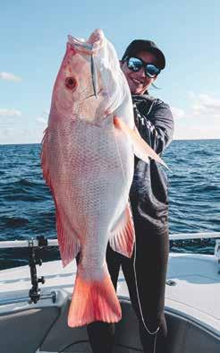 carrying capacity and the ability to stay out for multiple days if the weather allows. Once you’re on the outside edge of the reef use your charts to find pinnacles or large rises or drop-offs in 30m to 100m of water. I put out a spread of trolling lures as I sound these areas looking for bait and schools of doggies. Doggies mark-up extremely well and often sit midwater a long way off the bottom. They are nearly always hanging around baitfish and you most likely only sound them on the edge, above or below bait schools. Once you sound some bait and large fish hanging off the bait it’s time to drop the jigs and see what’s down there. The bycatch jigging for doggies is epic, as many large reef fish and other pelagics will hang around these areas. It just becomes a game of trying as many of these spots and bait schools you can until you find some marks holding dogtooth. Dogtooth hotspots are pinnacles and edges that have a lot of water movement running overtop or past them, which can be due to tide or the East Australian Current on the edge of the shelf. The water movement brings with it food and the dogtooth will hold here in wait.