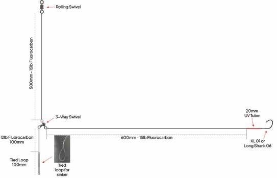 The Tinga Stinga is the latest addition to Black Magic’s successful range of whiting rigs, designed for areas with stronger currents and tidal flows. Available n two variations, it can be rigged with a KL 01 recurve hook, which tends to self-hook in the corner of the mouth for easier release of undersized fish, or a size 6 long shank hook, ideal for anglers who prefer to strike on the bite and easier to bait when using worms. Both setups are rigged on 15lb fluorocarbon with our trusted Black Magic swivels. Unlike our existing Whiting rigs, the Tinga Stinga features a 500mm backbone leading to a 3-way swivel. A 600mm trace extends from this, allowing the hook to wave enticingly in the current. A separate branch runs down to a pre-tied loop for the sinker, using a lighter 12lb line that breaks away if snagged, preserving the rest of the rig. The dropper loop allows for quick sinker changes to match shifting currents. Each pack includes two pre-tied rigs. For best results, pair with 12lb Hyperglide 13x Braid for precise casts into prime fishing zones.