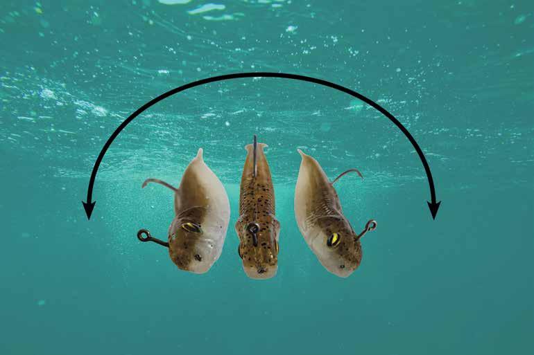 A strolling bait looks similar to a jerkshad, but has some subtle differences that allow the angler to get that rolling/strolling/swinging action. We experimented and pool-tested multiple plastics comparing standard jerkshads and lures that are marketed as strolling baits and there is a definite difference. With the right rod action (and correct jig heads) using a range of standard jerkshads, you can get a bit of that strolling action but it’s nowhere near the same. Soft plastic strolling baits in our findings are best when made from PVC (the non-stretchy style of plastic) as opposed to buoyant elastomer plastics (think Z-Man, Bait Junkie, Crush City). The heavier weight of PVC is advantageous, and the lures are often impregnated with salt in the lower half of the plastic, which increases the lure’s lower centre of gravity and helps achieve the strolling action. Generally, strolling baits have a curved shad-like belly with a flat top. They also often feature either a thin pin tail or a forked tail that runs horizontally or flat (like flounder or flathead as opposed to a vertical tail as on most fish and lures).
