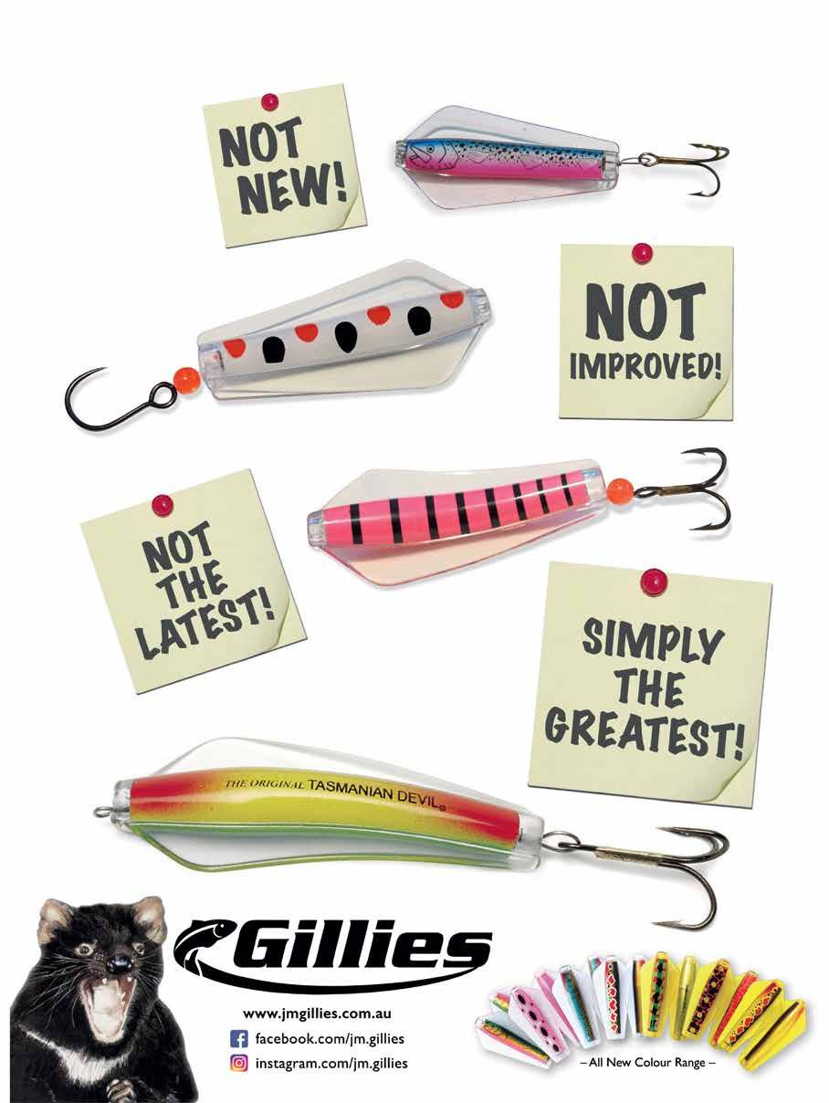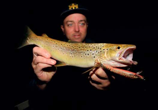 baits in among the boulders. Eerily, as we trolled exactly adjacent with the first bait fishos, in 25ft of water, the old man’s Sedona drag burst into song. After a few nervous moments at the boat, courtesy of a well-oiled net man, we scored our second 50cm+ brown for the trip, this time on the gold and red Stuckey’s lure.