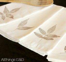 To start, forage for leaves throughout your yard or neighborhood. Grab a variety of styles and sizes – you never know what you’re going to like best! Choose a leaf and turn it over so the more veiny side is facing up. Dot craft paint on each leaf. I wanted to go with brown paint for this project but decided a little sparkle wouldn’t hurt, so I opted for a metallic brown paint. Brush paint across back of the leaf using a brush. Turn leaf over and carefully position it on your cloth napkin however you’d like it. Lay a paper towel over the leaf. This will ensure your rolling pin doesn’t get paint on it which could transfer to other spots on your napkin. Firmly roll over your leaf, transferring the paint to your napkin. Gently lift leaf from napkin – and you’re done! Practice on an old cloth napkin prior to trying this stamping technique on your final napkins. This will allow you to test out a variety of leaves to see how they transfer, as well as get a good idea of how much paint to apply for the look you’re going for. I opted to use this leaf-stamping technique on napkins, but it would also look beautiful on a runner, tablecloth, tote bags, gift wrapping paper and so much more.