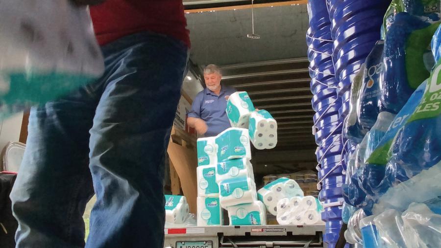 Gullion helps offload hundreds of rolls of paper products after driving a 26-foot U-Haul to a disaster relief staging area in Baton Rouge, La., on Sept. 14, 2021.