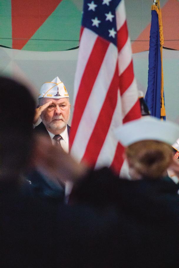 At a Pearl Harbor Remembrance Day ceremony held by Post 249 in Indianapolis, Commander Mark Gullion salutes the United States flag in honor of those lost on Dec. 7, 1941. The ceremony is concluded with a rifle volley and the placement of wreaths into the White River in Indianapolis, Dec. 7, 2021.