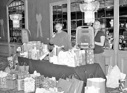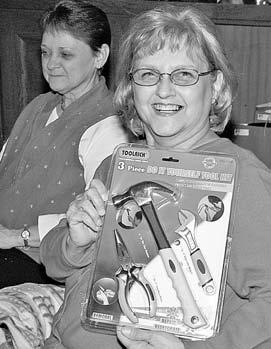 Department Adjutant Steve Short presides over the annual gift exchange that marks the Commander’s Christmas Party in Indianapolis each year, assisted by the commander’s able assistant, Aubrey Real. Meanwhile, First Lady Rosie Newman shows off a new set of tools by which she will attempt to maintain the Newman Household while he husband runs around the Department.