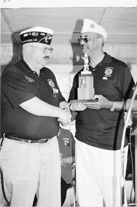 Bear With Him Department Membership Chairman Paul Steward, right, presents Seventh District Commander Harold Hensley with the coveted “Big Bear Award” recognizing his District’s first place finish in the membership program this year. The award, named for Department Commander Bill “Bear” Firkins, was a traveling trophy presented to the leading district at each target date, and presented as a permanent memento to the top finisher at the Close of Books during ceremonies on Legion Day at the Indiana Veterans Home, June 12.