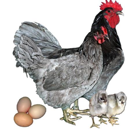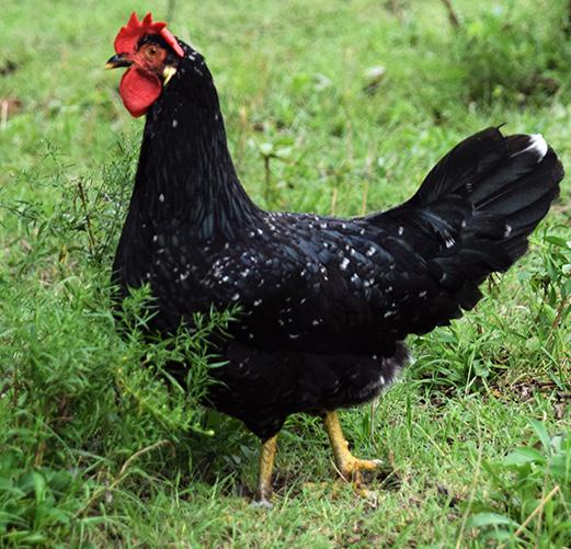 The Australorp, an Australian breed, was selected for its high egg production and was developed primarily from Black Orpingtons that were exported from England in the 1890s to early 1900. Australian breeders selected these large Black Orpingtons because of their efficient egg production and Orpington shape. Today, the Australorp is still a favorite egg producer in small, backyard flocks. Despite their record-breaking egg production, they are still considered a dual-purpose breed that grows at a good rate and has a well fleshed carcass. The plumage is pure black with an intense beetle-green sheen that is breathtaking when seen in the sunlight. Their legs and toes are also black, while the bottoms of the feet are white.
