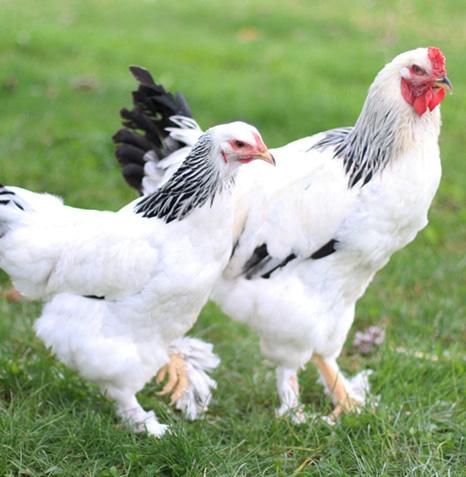 Barred Plymouth Rocks are a popular and attractive breed of chicken, known for their distinctive black and white striped plumage, which creates a striking "barred" pattern across their feathers. This eye-catching coloration is one of the breed's most defining features, giving them a bold and classic appearance. Their feathers are smooth and fit tightly against their bodies, with a rounded shape and a broad, deep chest that gives them a sturdy and wellproportioned look.