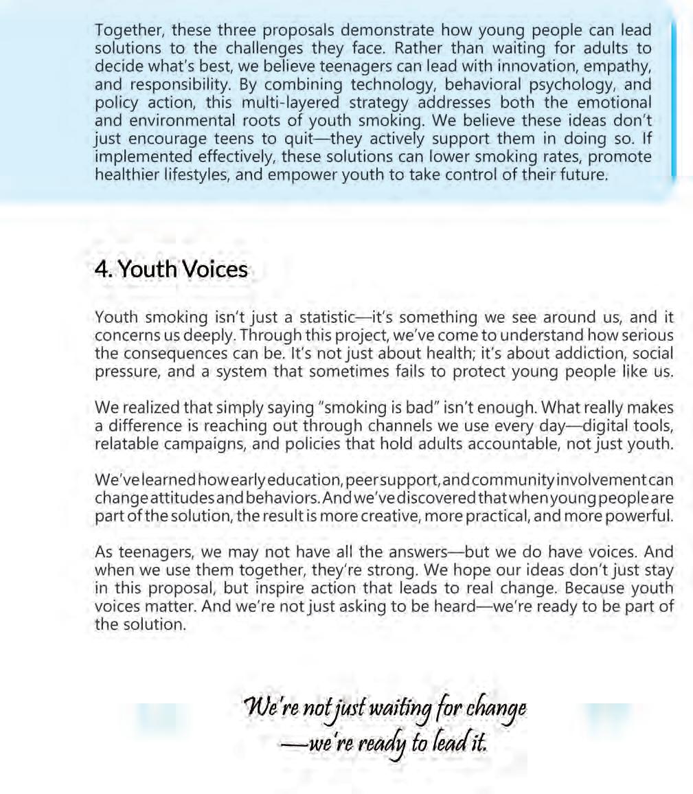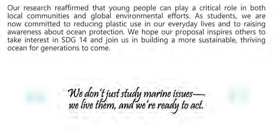 In addition, we, the youth who are the leaders of the future, have an important role to play. It is to raise awareness about the seriousness of marine pollution and to be the starting point for change through continued interest and practice. The idea I proposed today can only become a reality when all of us here work together.
