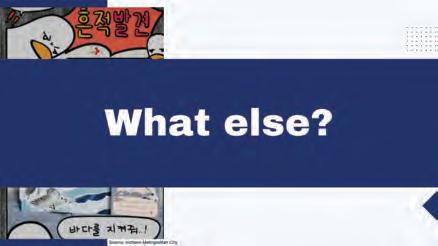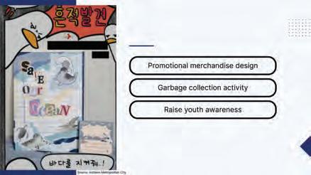 Let’ s look at a real example. This is a campaign organized by one of the Grade 2 students at Yeil High School in Incheon. The students created their own promotional merchandise designs to raise awareness of vanishing marine species such as the black-headed gull and sangwangyee. They also organized garbage collection activities at Eurwang-ri Beach in Incheon. It showed how young people can take meaningful action in their own communities. How else can we raise awareness like this? That’ s why we propose‘Unfold the story of the ocean! The Incheon Ocean Fairy Tale Competition.’With its rich history, traditions, and culture, Incheon has many stories that have been passed down through