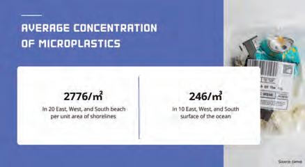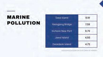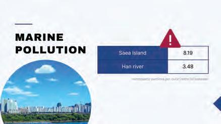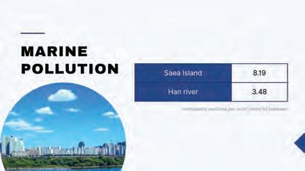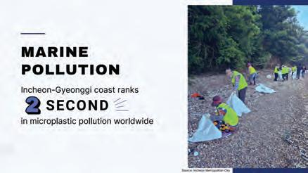 Let's take a closer look at the wetlands of Incheon. Incheon’ s wetlands are not just beautiful landscapes; They are vital ecosystems that support a rich diversity of marine life. These areas provide critical habitats for various fish species, benthic organisms, seaweeds and shellfish, and even endangered migratory birds. But the value of these wetlands goes beyond just biodiversity. They also play a key role in carbon storage, helping to absorb and trap carbon dioxide, which is essential in our fight against climate change. In addition, these wetlands also act as natural filters, they help remove pollutants from streams before the water flows into the ocean. It improves ocean water quality and supports the overall health of the marine environment. As we explore Incheon's unique features, it becomes clear that preserving these natural resources is not only essential for marine biodiversity but also for protecting the livelihoods of local communities. What pressing issues confront the coast of Incheon, a region of immense significance for the health and balance of our marine ecosystem? To begin with, Incheon's coastal waters are burdened by significant levels of marine pollution. Alarmingly, a recent study revealed that the coastline of Incheon, along with the neighboring Gyeonggi region, has been ranked as the second most plasticpolluted area in the world. A recent study shows just how serious marine pollution around Incheon has become. According to the data, the number of microplastic particles per cubic meter of seawater off the coast of Incheon ranged from a minimum of 4.75 to a maximum of 8.19. Given the size of the Incheon Sea, these numbers are far from small. To see how serious this is, we can compare it to the upstream of Han River, which has the largest catchment area of any river in South Korea, even larger than the River Thames in the UK. In the Han River, the concentration of microplastics is 3.48 particles per cubic meter, while in Saea Island, the most polluted site in Incheon, the figure reaches 8.19 ? a difference of more than 4 particles per cubic meter. This comparison shows that microplastic pollution in Incheon’ s water is at a high risk level and needs immediate attention. Microplastics pose a serious threat to marine life, as many sea animals mistake them for food. This doesn’ t just harm individual species, it also disrupts the