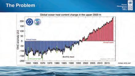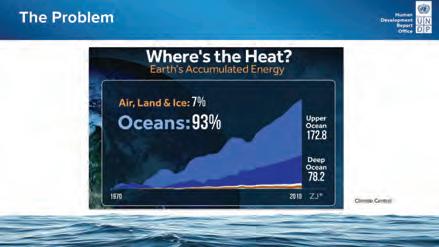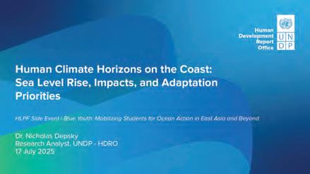 In his speech, Nicholas Depsky provides a scientific analysis of how climate change impacts oceans and humanity, along with practical response measures. He utilizes the UNDP's Human Climate Horizons platform to analyze the effects of climate change on various sectors, including sea-level rise, heatwaves, and agriculture, emphasizing the importance of policy responses based on this data. He explains that more than 90% of the heat energy trapped by global warming is absorbed by the oceans, causing sea levels to rise. The primary drivers are thermal expansion and the melting of glaciers and ice sheets. Since 1880, sea levels have risen by about 25 cm, with a projected acceleration after 2050, which increases the risk of coastal flooding and amplifies the damage from storm surges.