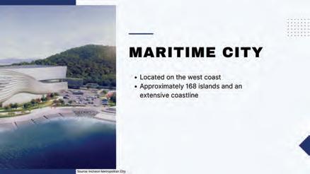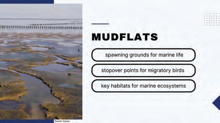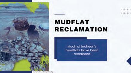 and its community, often located near ports or along coastlines to take advantage of access to the sea. And, Incheon is a maritime city uniquely located on the west coast of South Korea. With around 168 islands and a long, expansive coastline, Incheon is home to a diverse and rich marine environment. There are two elements of Incheon's sea that are particularly important. The mudflats and wetlands are shown here. But these mudflats are not just beautiful, they also play a critical role in the marine ecosystem. Incheon's mudflats serve as spawning grounds for marine life, resting and feeding sites for migratory birds, and key habitats for the marine ecosystem.