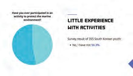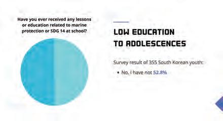 The third reason is that youth have little experience with marine ecosystem activities, and there is not enough education on this topic in schools. In fact, according to the data we collected, when students were asked“Have you ever had a lesson or training related to ocean conservation or SDG 14 in school?” , 52.8% responded,“No, I have not.”When asked,“Have you ever participated in any activity to protect the marine environment?” , more than half answered no. So, what kind of effort is needed to solve these problems?