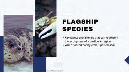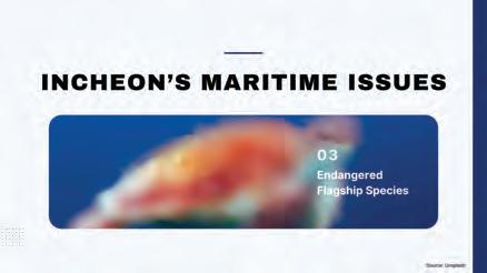 The third is the loss of endangered and flagship species. Flagship species, a term introduced by United Nations Environment Programme, refer to key plants and animals that can represent the ecosystem of a particular region. Incheon is home to several of these key species, including the white-footed booby crab and the spotted seal, which are facing serious threats due to habitat destruction. Ongoing land reclamation and other development projects are threatening their survival. For example, the spotted seal depends on stable coastal habitats for breeding and feeding. As we witness changes in the marine environment, the urgency of taking conservation action is becoming increasingly clear.