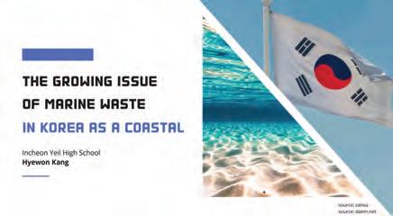 The topic I will present is the growing issue of marine waste in South Korea as a coastal country. Today, based on the topic, I would like to identify existing ocean-related problems in South Korea, share what we have tried to overcome, and suggest a creative idea to tackle this. Also, as I conducted a survey of more than 350 Korean youth on SDG 14, I will be sharing the results as well.