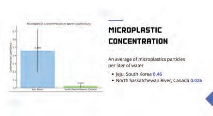 Jeju coast of South Korea and the North Saskatchewan River in Canada, where there is a large difference in microplastic concentrations. The average of microplastic particles per liter of water, was found to be 0.46 in Jeju and 0.026 in the North Saskatchewan River. Based on the numerical data, we can realize the severity of microplastic pollution in South Korea, which is about 17 times higher than in Canada.