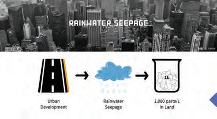 The first reason is the rainwater seepage caused by urban development. As cities develop, there are more watertight surfaces like asphalt roads and cement sidewalks. These surfaces do not allow rain or snow to soak into the ground, so that water flows over them. As a result, the amount of rainwater seepage increases, and the studies have shown that up to around 1,080 microplastics per liter were found in industrial and residential areas. This shows that rainwater runoff is a key pathway through which microplastics from land are moved into rivers and oceans.