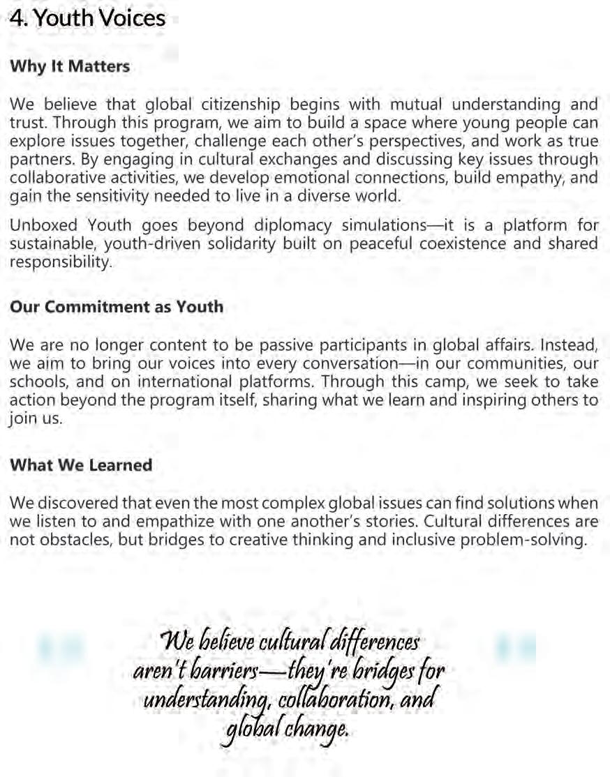 As young people, we are not just observers. To create real change, we need to communicate clearly, understand and respect, and always learn new things. With these three skills, we can build a world that is more sustainable, more inclusive, and more connected. We can do it together, so let's do it! Thank you for listening.