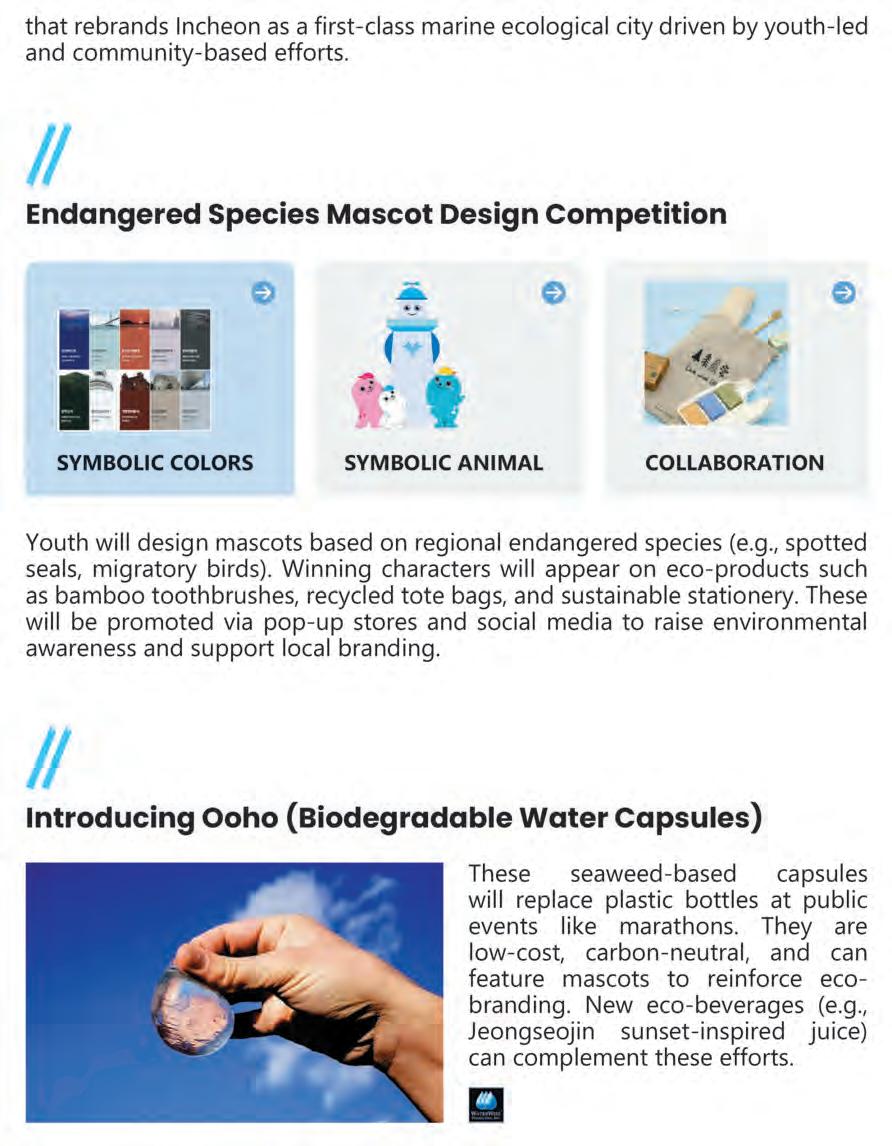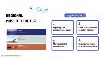 Based on the data showing that teenagers have low awareness and less active participation in marine-related issues, I suggest two solutions. The first is to hold a regional mascot contest for students. Mascots should reflect both local characteristics and themes related to marine pollution and marine life. For example, in Incheon, where we are from, we could create mascots that use colors or symbols representing the region. I believe the contest will not end here, but will expand into long-term projects such as exploring the contaminated coastal areas or beach cleanups with the winning mascots. By visualizing marine issues through student-led mascots, this can encourage independent participation and make environmental action feel more accessible to youth. It would also be a valuable opportunity to learn about and reflect on the current state of the marine ecosystem in an engaging way.