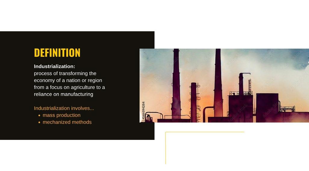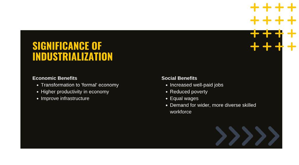 One of the critical components of achieving economic development is industrialization. Industrialization is defined as the process of transforming the economy of a nation or region from a focus on agriculture to a reliance on manufacturing. This process involves mechanized production methods, which are signified by using machines instead of manual work.