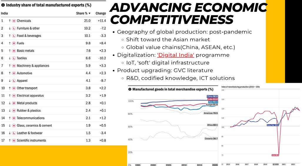 Our presentation topic was industrialization in India. We chose to focus on a specific region and conduct a general case study, as this approach allowed us to include moderately broad yet regionspecific information. The primary reasons for selecting this topic were India's vast history related to industry and the potential to investigate its current situation. India has been industrializing since the 19th century, and this history and environment have continued to impact its industries today. The long history of over a hundred years provided us with plenty of materials to investigate during our research. Furthermore, India's industry had already achieved global competitiveness, but it was also plagued by various multifaceted issues, making it suitable for research and presentation. We could delve into the root causes of these issues and find appropriate solutions during our preparation process.