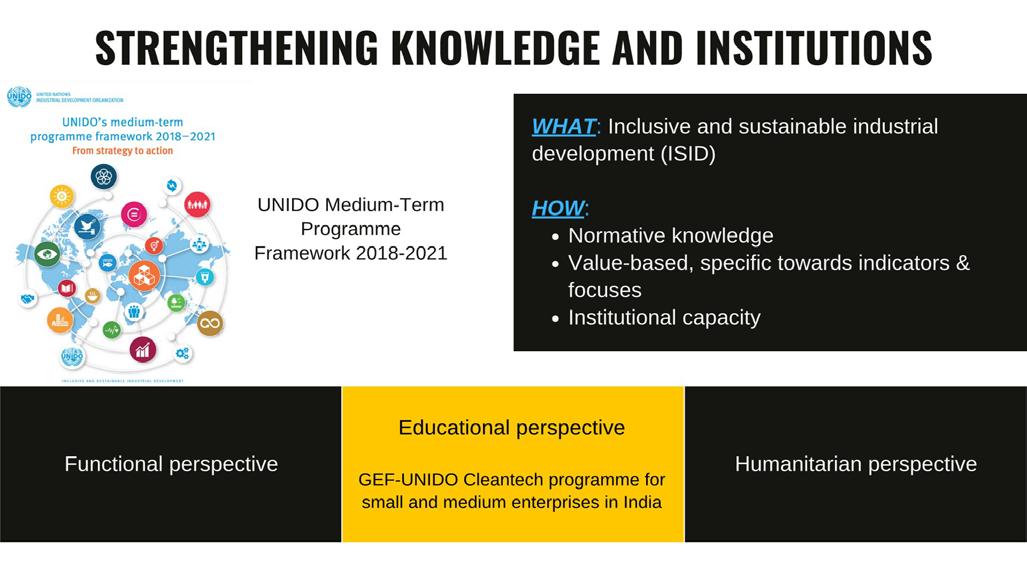 Its assistance is based on two core functions: as a global forum generating and disseminating industryrelated knowledge; and providing technical support and cooperation. The UNIDO also provides its support through four mandated functions: technical cooperation; action-oriented research and policyadvisory services; normative standards-related activities; and fostering partnerships for knowledge and technology transfer.
