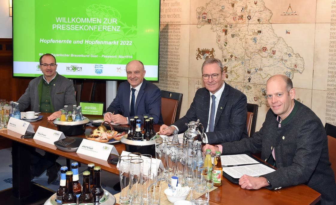 Foto: v.l.n.r.: Dipl. Ing. Walter König (Geschäftsführer, Bayerischer Brauerbund e.V.), Pascal Piroué (1. Vorsitzender, Deutscher Hopfenwirtschaftsverband e.V.), Adolf Schapfl (Präsident, Verband Deutscher Hopfenpflanzer e.V.), Mario Schäfer (Geschäftsführer, Privater Brauereien Bayern e.V.)
