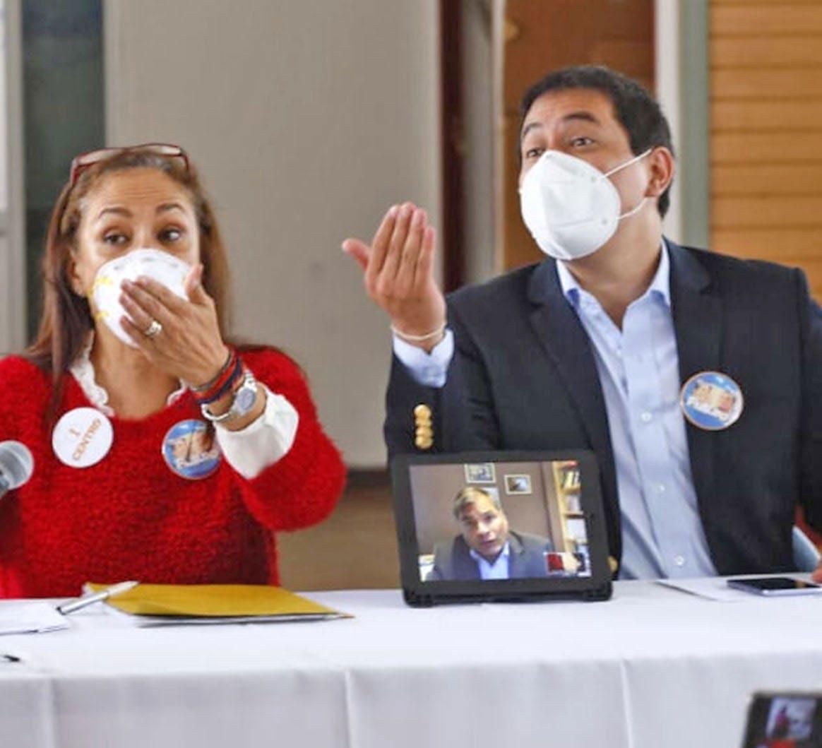 Como es costumbre de los candidatos ecuatorianos, los aspirantes por la lista 1 llegaron acompañados por sus simpatizantes a las oficinas del CNE. Uno de ellos cargaba en brazos un iPad, en el que se veía solo el rostro del expresidente Correa. Él estaba conectado en directo.