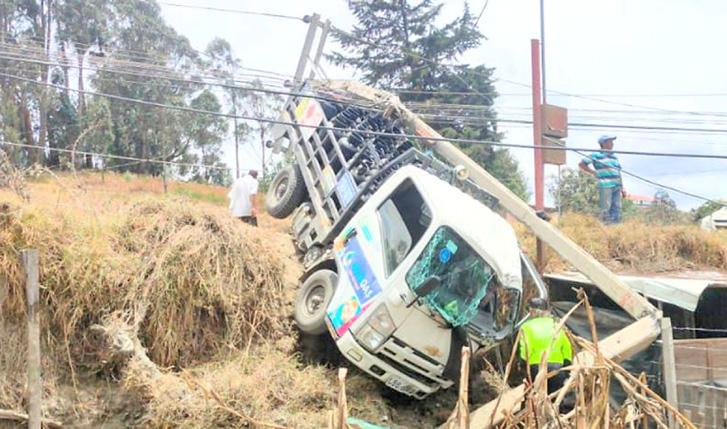 El poste de alumbrado público con el cual se chocó un camión pequeño de distribución de gas no lo contuvo y el automotor se precipitó a una ladera pequeña de un lote de terreno.