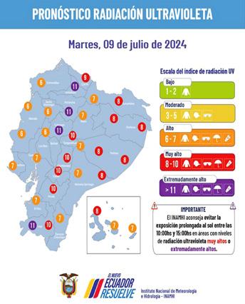 El Instituto Nacional de Meteorología (Inamhi) compartió las previsiones sobre el nivel de radiación ultravioleta para este martes, 9 de julio de 2024, así como lo hizo ayer, lunes.