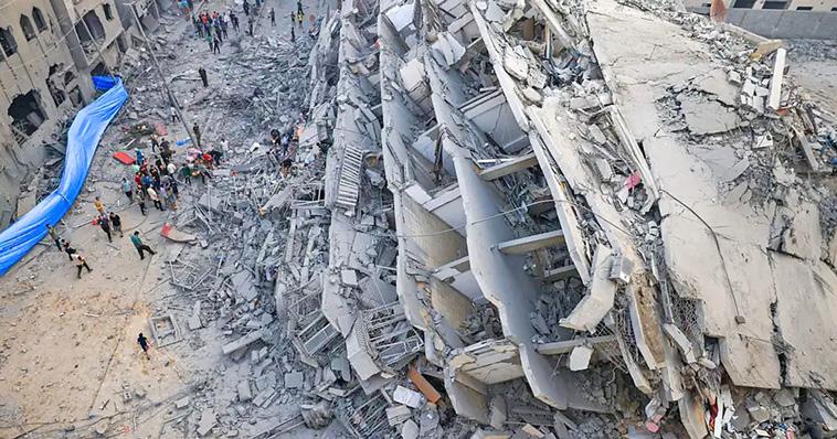 » Palestinos inspeccionan un edificio derribado por un bombardeo israelí en Gaza.