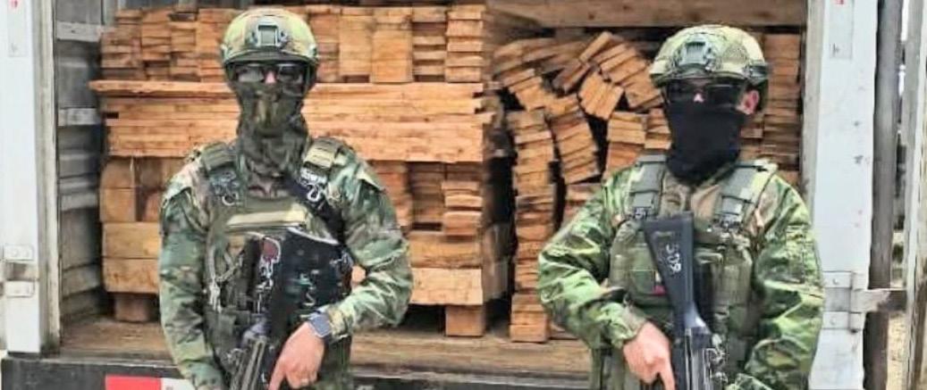 La madera que el martes 8 de abril de 2025 se transportaba en un camión blanco, marca Chevrolet, de placa de la provincia de Pichincha (P), no fue justificada legalmente por el conductor y los soldados del Batallón de Infantería Motorizada Número 20 ‘Cptn. Díaz’, retuvieron esa mercadería.