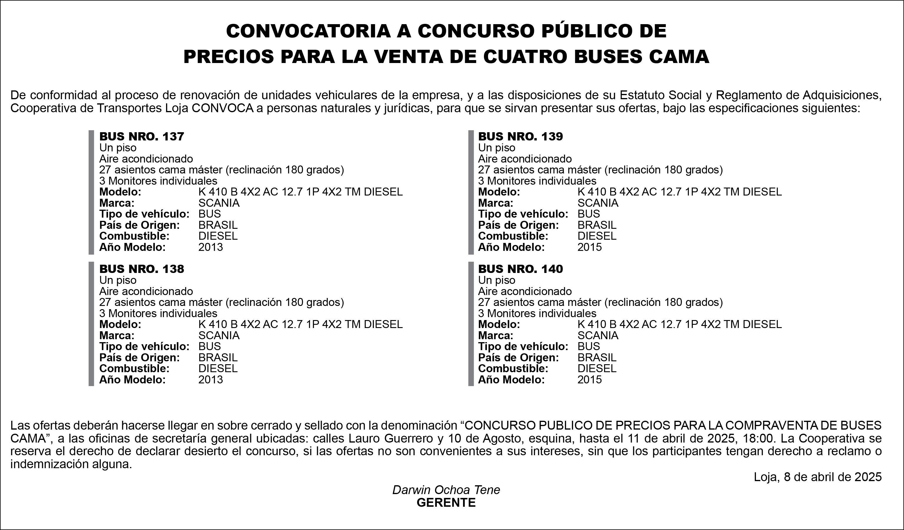 Antonio Eguiguren (Local Tenet o Lápidas Suárez). Para más información, se puede contactar al número 0981708908. También se hace un llamado a