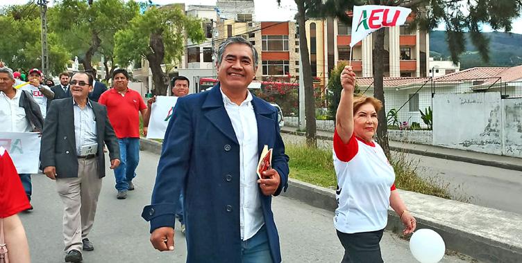 la Alma Máter. Amigos, estudiantes, docentes y más ciudadanos que respaldan su candidatura lo acompañaron. Un distintivo que destacó fue una gigantesca bandera del cantón Loja. También hubo una banda de pueblo que puso el toque musical a la marcha.