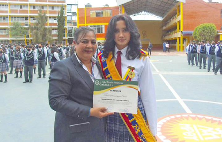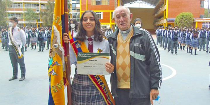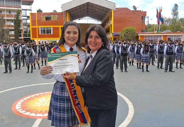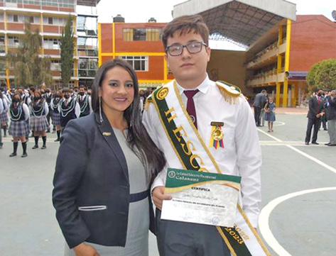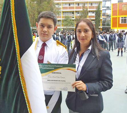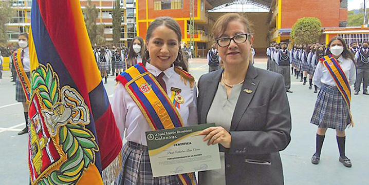 » Yostin Sebastián Robles Quille, segunda escolta del estandarte del Plantel, junto a Andrea Sarango, integrante del Consejo de Rectoría de la Institución.