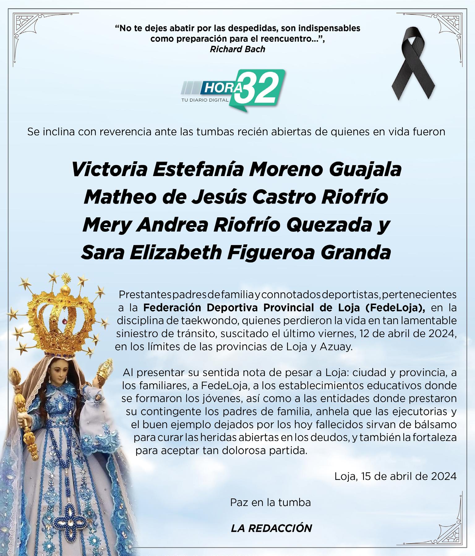 En medio del dolor general, la ciudad dio su postrer adiós a las cuatro víctimas fatales del accidente del bus de FedeLoja: Victoria Estefanía Moreno Guajala, Matheo de Jesús Castro Riofrío, deportistas, y las madres de familia: Mery Andrea Riofrío Quezada y Sara Elizabeth Figueroa Granda. Hay conmoción. Se decretó dos días de duelo.