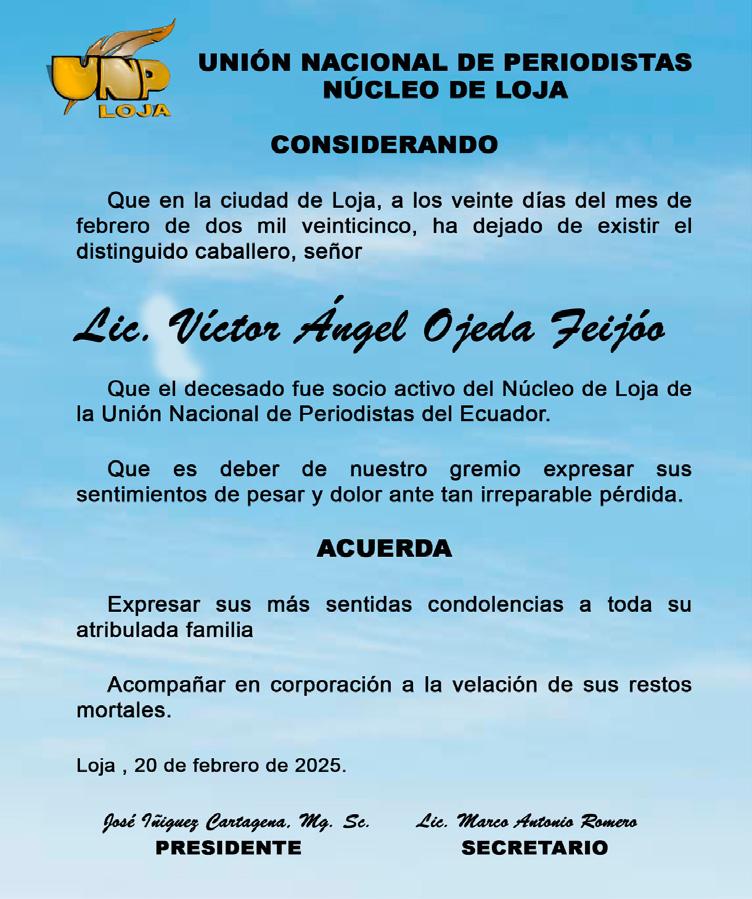 De manera inesperada, este jueves, 20 de febrero de 2025, a los 76 años de edad, dejó de existir el prestante periodista lojano, Víctor Ángel Ojeda Feijóo. Su partida enluta a respetables hogares de la ciudad, así como llena de consternación a sus amigos, allegados y colegas comunicadores sociales de la localidad y del país.