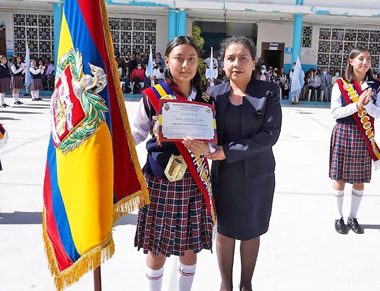 » Portaestandarte de la Ciudad, Yuli Jiménez, y escoltas, primera Nicole Ludeña y segunda Doménica Jiménez.