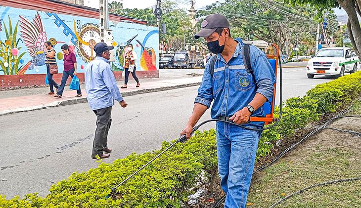 Personal municipal cumple con trabajos de fumigación del parterre de la Avenida Catamayo, en la ciudad del mismo nombre, con la finalidad de proteger estos espacios verdes de las diferentes plagas que aparecen en épocas invernales. (Foto: Municipio de Catamayo)