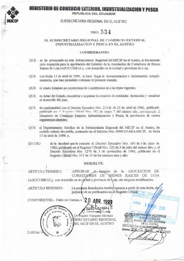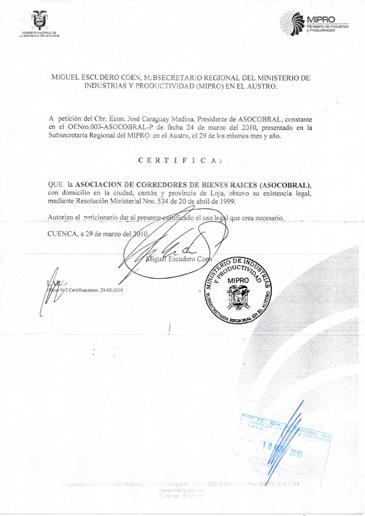 En el año de 1998, 11 aspirantes con una visión emprendedora y con la colaboración de la Federación Nacional de Corredores de Bienes Raíces del Ecuador (FENACBRE), aprobaron el Curso de formación Profesional de Corredores de Bienes Raíces, en esa oportunidad, decidieron organizarse para conformar lo que en un principio se denominaría ASOCOBRAL Asociación de Corredores de Bienes Raíces de Loja; inician con los trámites respectivos para que la Asociación sea legalmente reconocida por el Ministerio de Industrias Comercio Integración y Pesca, (hoy Ministerio de Producción, Comercio Exterior, Inversiones y Pesca), alcanzando su vida jurídica el 20 de abril 1999, con acuerdo ministerial 534, fecha en la que inicia sus actividades bajo la Presidencia del Economista José Caraguay Medina, sus objetivos eran claros propender a la