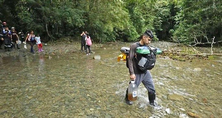 » Grupos de personas cruzan un río en el Tapón del Darién (Colombia) para llegar a Panamá.