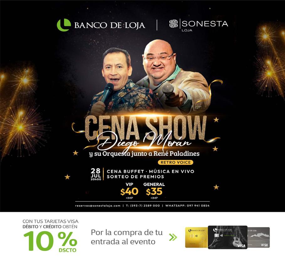 En el Hotel Sonesta, de la ciudad de Loja, se llevará a cabo este viernes, 28 de julio de 2023, la denominada cena show, donde la fusión de ritmos de las décadas de 1970, 1980 y 1990, al igual que la cumbia y salsa, promete cautivar a personas de todas las edades. El talentoso músico lojano, René Paladines, y el destacado salsero y sonero colombiano, Diego Morán, serán los líderes del evento.