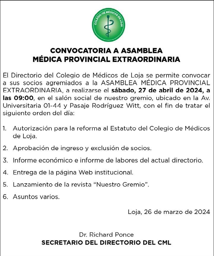 El viernes 5 de abril de 2024, se llevará a cabo la reunión de la Asociación de Fútbol Profesional de Loja con el propósito de elegir el nuevo directorio, encabezado actualmente por Telmo Castro Piedra. La asamblea está programada para las 16:00 horas en el salón de la Casa de la Asociación. Durante la reunión se procederá a la verificación de credenciales, se constatará el quórum, y se presentará el informe administrativo y económico correspondiente al período de la