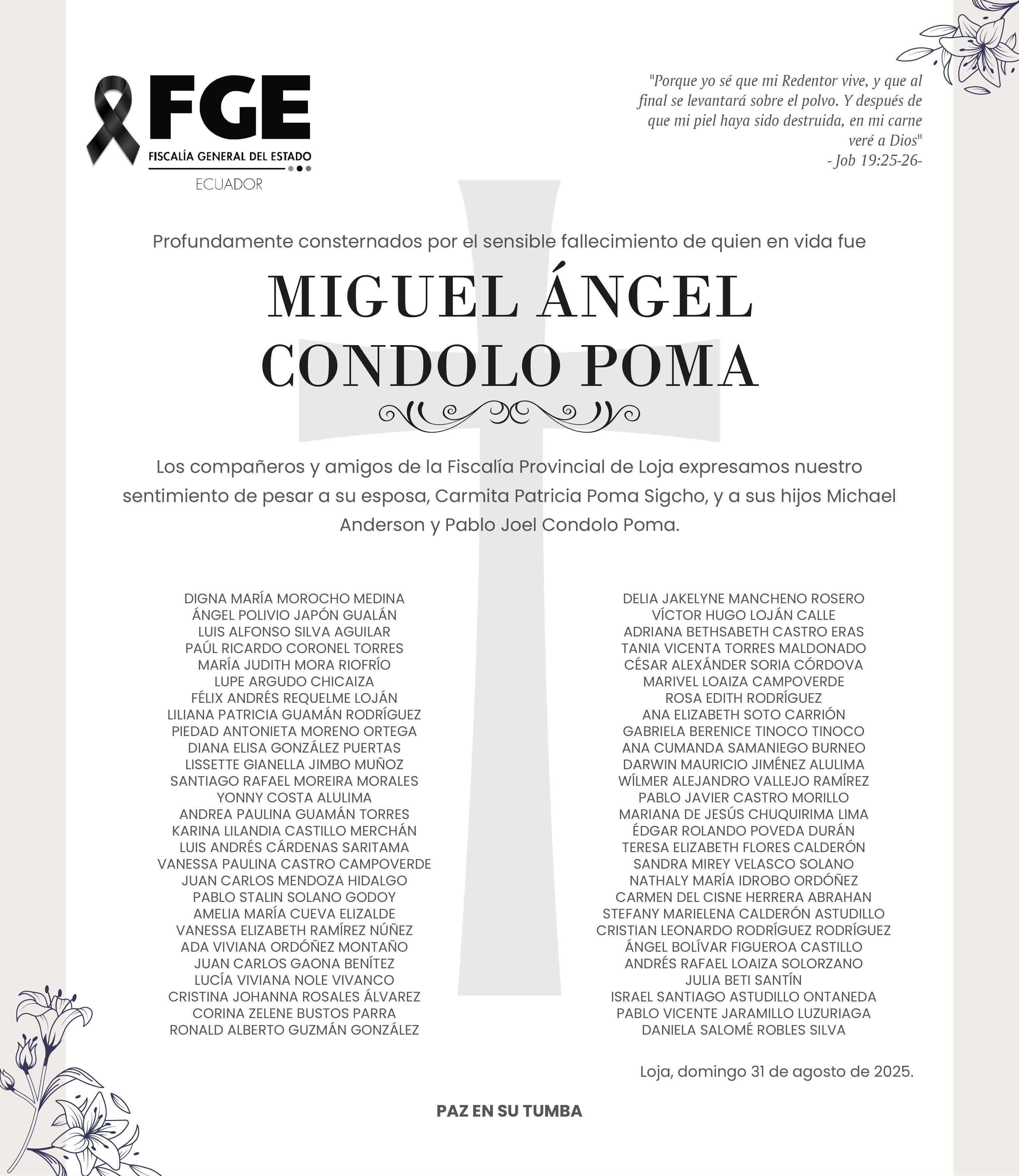 Con un minuto de silencio en honor a la memoria del expresidente del Núcleo de Loja de la Casa de la Cultura Ecuatoriana Benjamín Carrión (CCE-Loja), Marco Antonio Placencia Espinosa, empezó el acto de juramento y entrega de credenciales al nuevo directorio de la entidad, período 2025-2029, encabezado por Julio César Espinoza Bustamante.