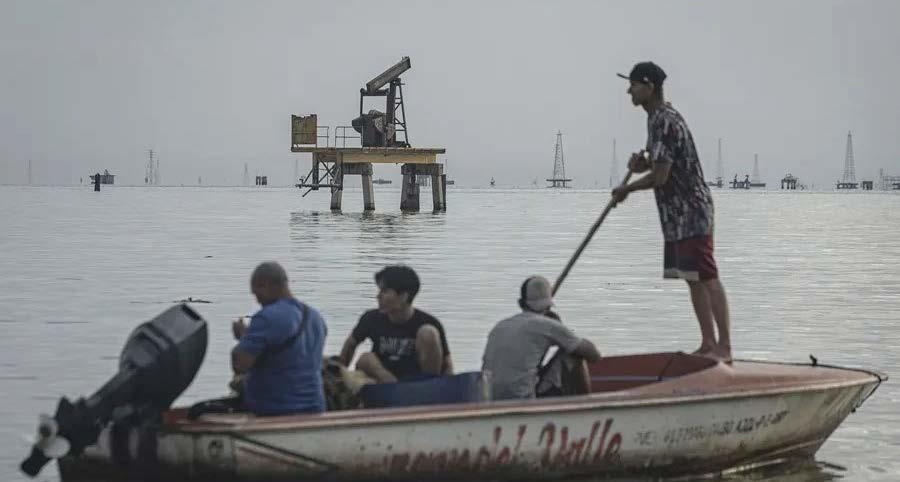 » Personas navegan frente a plataformas petrolíferas, en Cabimas (Venezuela).