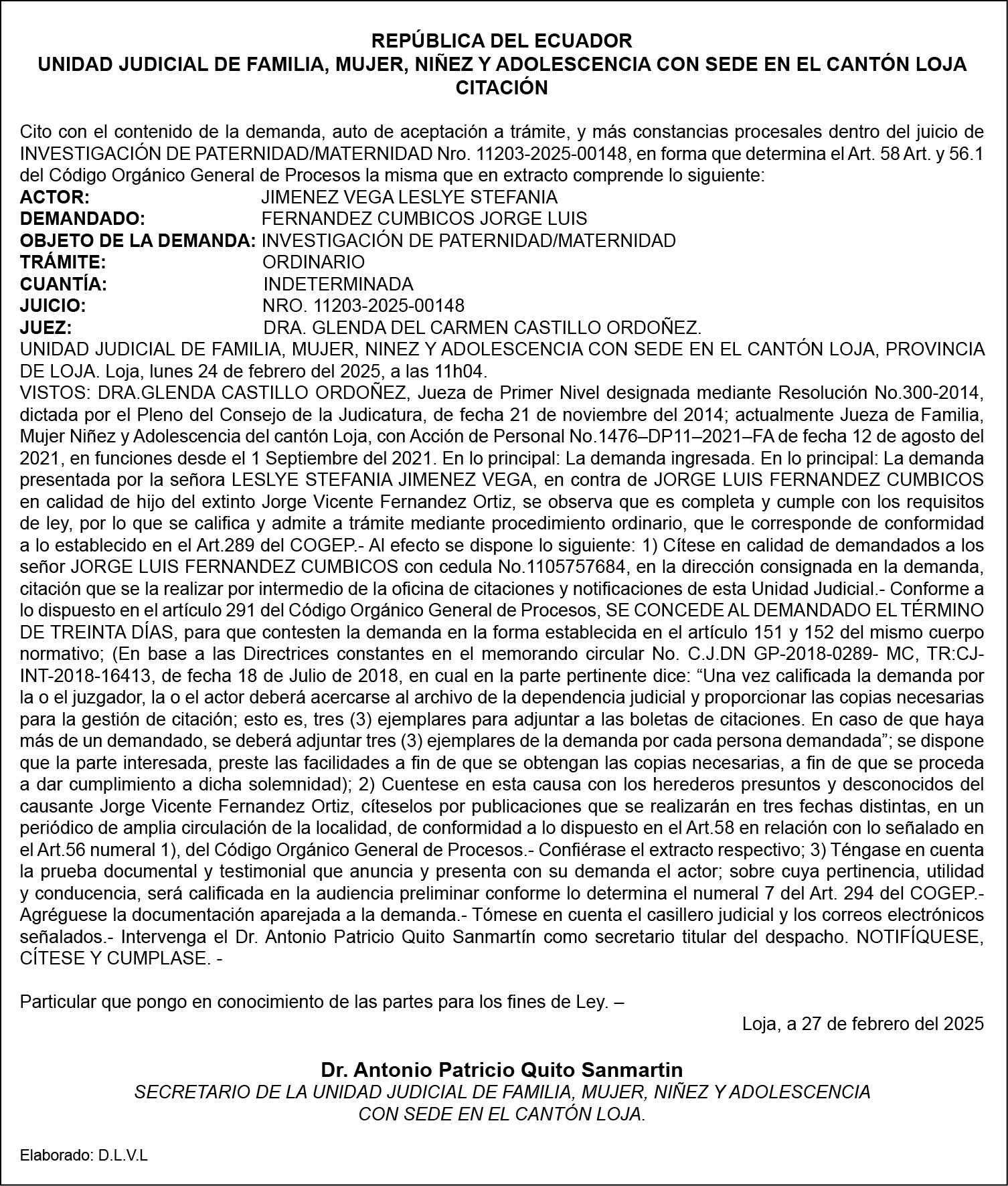 grancia y formulación de cargos se realizará este miércoles 7 de mayo de 2025, a las 08:00, en la Unidad Judicial Multicompetente de la Corte de Justicia de Loja, en ese cantón.