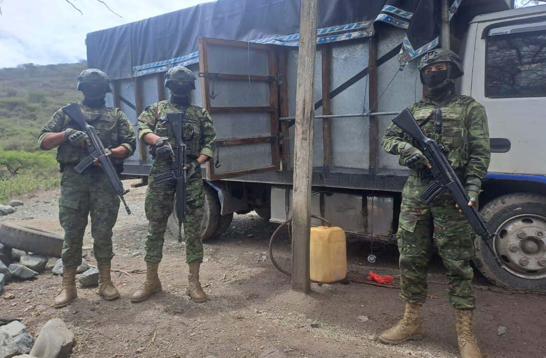 Los 54 galones de combustible, presuntamente diésel; los 3 cilindros de gas licuado de petróleo, de uso doméstico; y un camión que habría sido modificado el tanque de combustible fueron decomisados por los soldados del Ejército ecuatoriano el lunes 12 de enero de 2026.