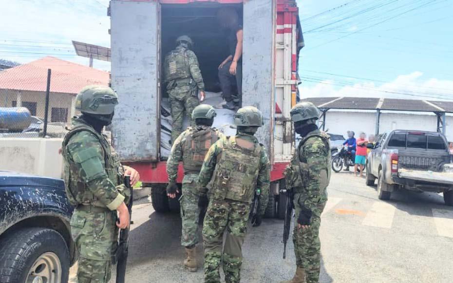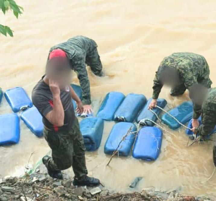 Las 40 canecas que el jueves 12 de febrero de 2026, un grupo de ciudadanos transportaba fueron abandonadas en el río del barrio Las Mallas, del cantón Macará, de la provincia de Loja, y los presuntos contrabandistas huyeron y los soldados de las Fuerzas Armadas las decomisaron.