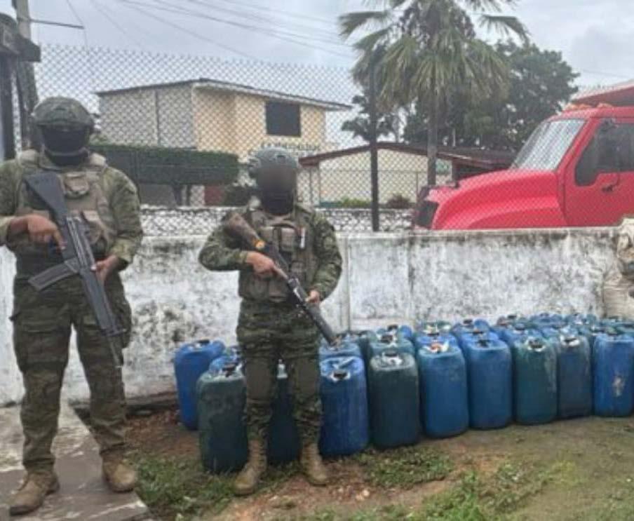 En ese lugar los soldados encontraron 56 canecas azules de combustible, presuntamente, diésel, con una capacidad de 10 galones, cada una; y un vehículo blanco, marca Toyota, de placa de la provincia de Cotopaxi (X), en el cual se transportaba ilegalmente ese producto.